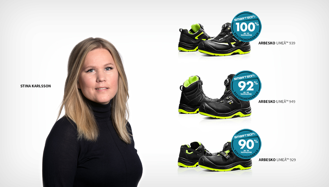 Smartson invited test pilots to try the shoes in their profession. During the test period, the protective shoes were worn from inside tractors to on top of roofs, in barns and in TV studios. The opinions of the 99 test pilots showed that the models from the Arbesko Umeå series received a fantastic result of 90%, 92% and 100% recommendation.